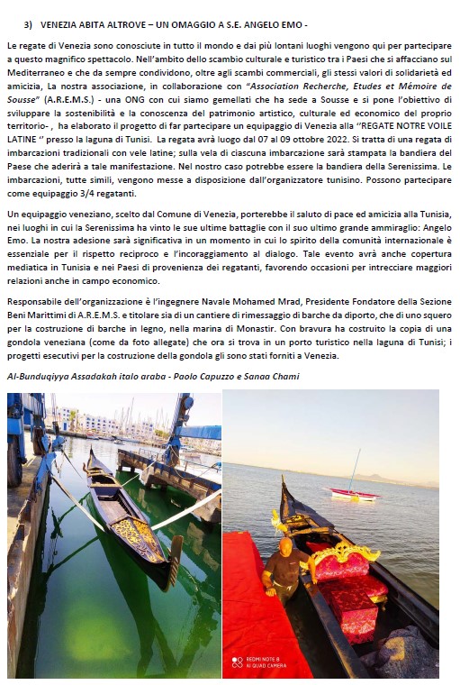 في نفس قيم التضامن والصداقة ، فإن جمعيتنا بالتعاون مع "Association Recherche، Etudes et Mémoire de سوسة "(A.R.E.MS) - وهي منظمة غير حكومية توأمتنا معها ومقرها سوسة وتهدف إلى تطوير الاستدامة والمعرفة بالتراث الفني والثقافي والاقتصادي لإقليمها - مشروع "نوتر فويل لاتين" ( شراعنا اللاتيني) هو سباق للقوارب في شمال بحيرة تونس. سيقام هذا السباق في الفترة من 07 إلى 09 أكتوبر 2022. وهو سباق القوارب التقليدية مع أشرعة لاتينية ؛ سيتم طباعة علم الدولة المشاركة في هذا الحدث على شراع كل قارب. بالنسبة لمدينة فينيسيا سيطبع علم Serenissima. القوارب ، كلها متشابهة ، يتم توفيرها من قبل المنظم التونسي. يمكن أن يشارك 3/4 من البحارة كطاقم يمثل إيطاليا.