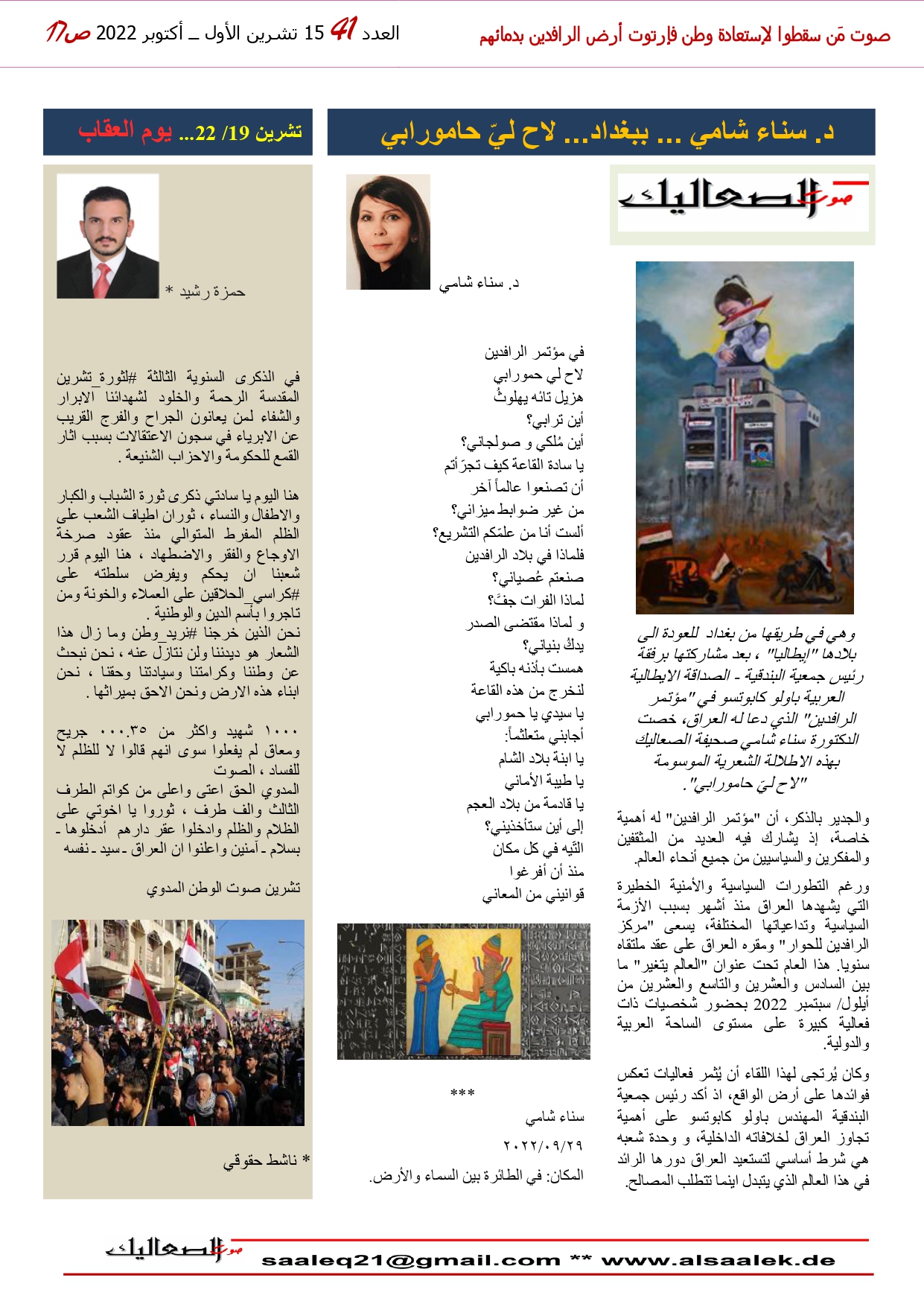 وهي في طريقها من بغداد للعودة إلى بلادها "إيطاليا" ، خصت الدكتورة سناء شامي صحيفة الصعاليك بهذه الإطلالة الشعرية الموسومة "لاح لي حمورابي"