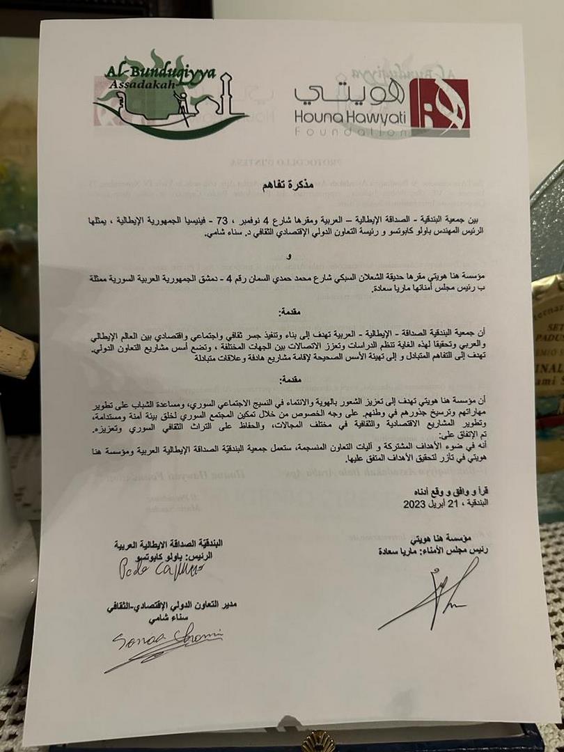 Quale presidente della Fondazione Houna Hawyati, Maria Saadeh, ha firmato un memorandum di intesa con la nostra associazione, ed abbiamo pianificato diversi progetti da seguire e sviluppare insieme. Durante il suo soggiorno a Venezia, la nostra associazione ha organizzato una serie di incontri importanti:
