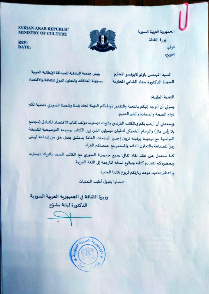 و بالتحديد إلى رئيس الجمعية المهندس باولو كابوتسو و مسؤولة العلاقات الدولية الإقتصادية - الثقافية الدكتوره سناء شامي، نشكرهما على جهودهما النبيلة. كما أكدت ترحيبها بالكاتب باتريك ديسّارت مؤلف كتاب الإقتصاد المتبادل (مجتمع من غير رأس مال)، و الرسام آنطوان ديمولين الذي زيّن الكتاب برسومه التوضيحية للكتاب. كما رحبت الوزيرة برغبة آنطوان في تزيين إحدى الساحات العامة في دمشق بإحدى رسومه كهدية تعبّر عن الصداقة مع الشعب السوري. كما أكدت الوزيرة على عقد لقاء ثقافي يجمع الكاتب باتريك مع الجمهور السوري لنقاش كتابه، و لتوقيع أول نسخة من كتابه الذي تمّ ترجمته إلى اللغه العربية. ثم ختمت الوزيرة رسالتها بالتمنيات الطيبة انا إلى حين اللقاء في سوريا.