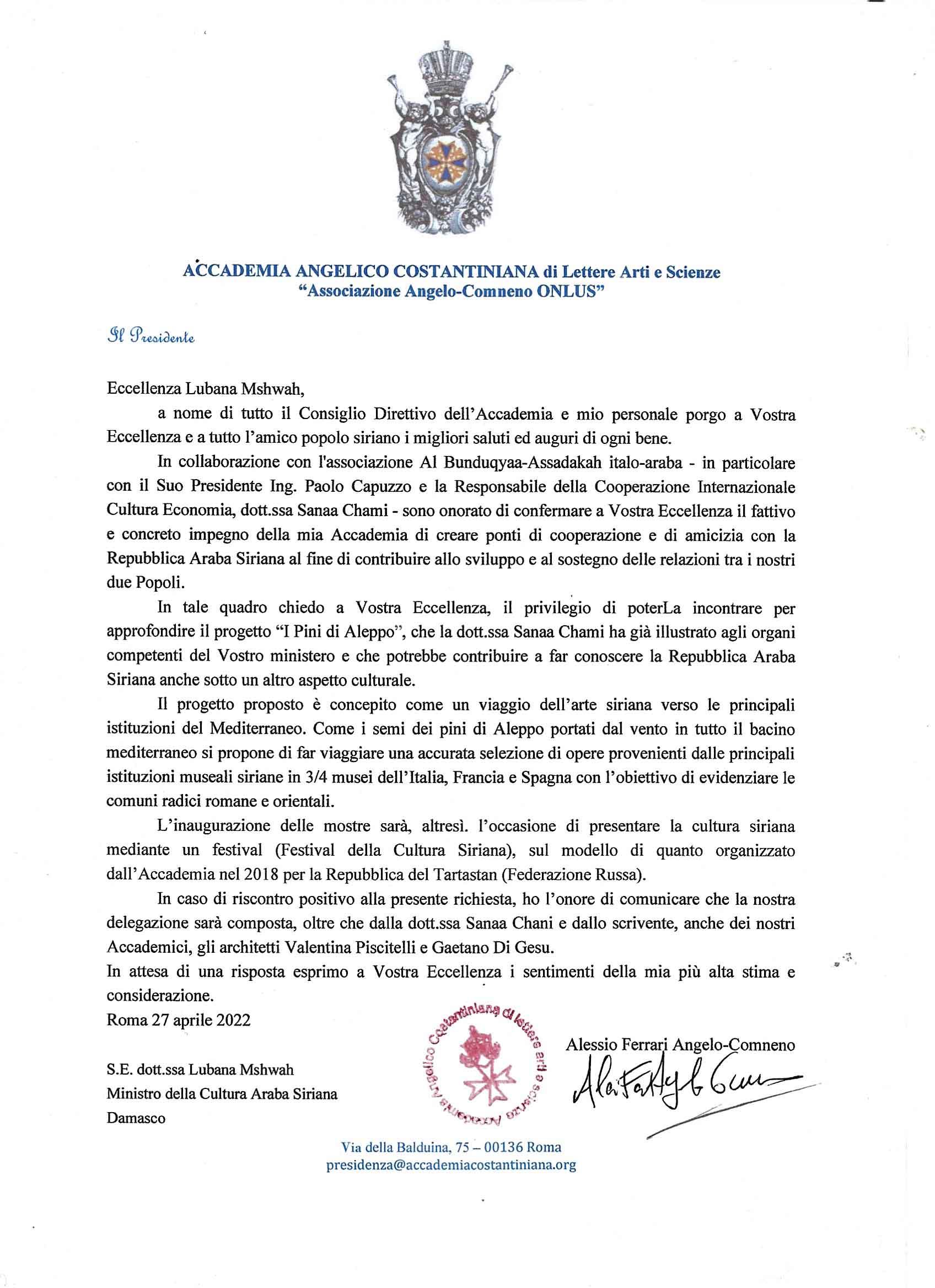 بالتعاون مع جمعية البندقية-الصداقة الإيطالية-العربية و بشكل خاص مع رئيسها المهندس باولو كابوتسو، و مع مسؤولة التعاون الدولي الثقافي- الإقتصادي للجمعية، أتشرف بالتأكيد لسعادتكم الإلتزام الفعّال و الملموس لآكاديمبتي في خلق جسور تعاون و صداقة مع الجمهورية العربية السورية و ذلك من أجل مساندة و تطوير العلاقات بين شعبينا.