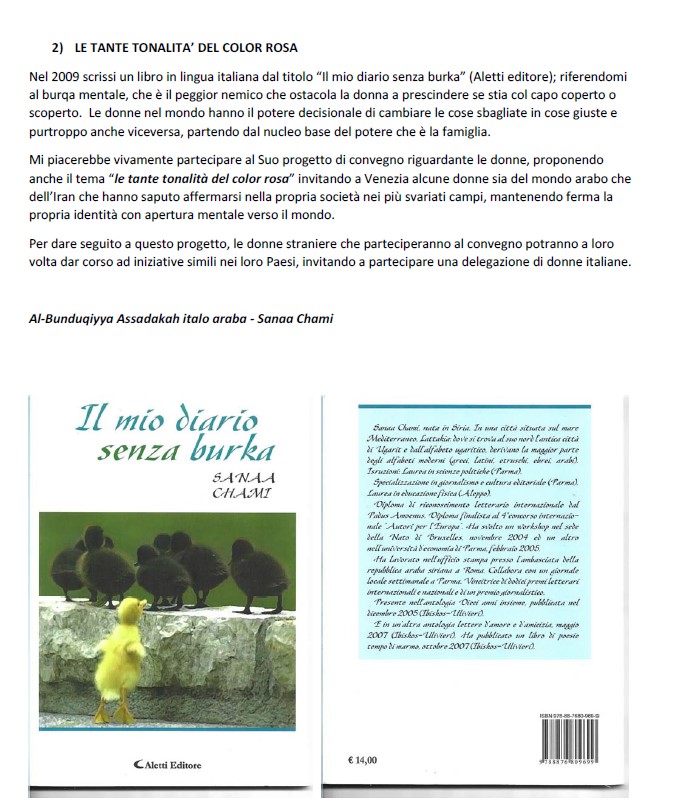 ؛ في إشارة إلى النقاب الذهني وهو أسوأ عدو يعيق المرأة بغض النظر عما إذا كانت مغطاة أو مكشوفة الرأس. تتمتع النساء في العالم بسلطة اتخاذ القرار لتغيير الأشياء الخاطئة إلى الأشياء الصحيحة والعكس صحيح للأسف ، بدءاً من النواة الأساسية للسلطة ألا و هي الأسرة. جمعية البندقية الصداقة الإيطالية العربية تود المشاركة في مشروع المؤتمر الخاص الذي تعدّون له و المتعلق بالمرأة. بالإضافة ، لدعوة بعض النساء الفاعلة من العالم العربي اللواتي استطعن إثبات وجودهن في مجتمعهن في أكثر جميع المجالات، بإنفتاح فكري تجاه العالم مع الحفاظ على هويتهن و خصوصيتهن