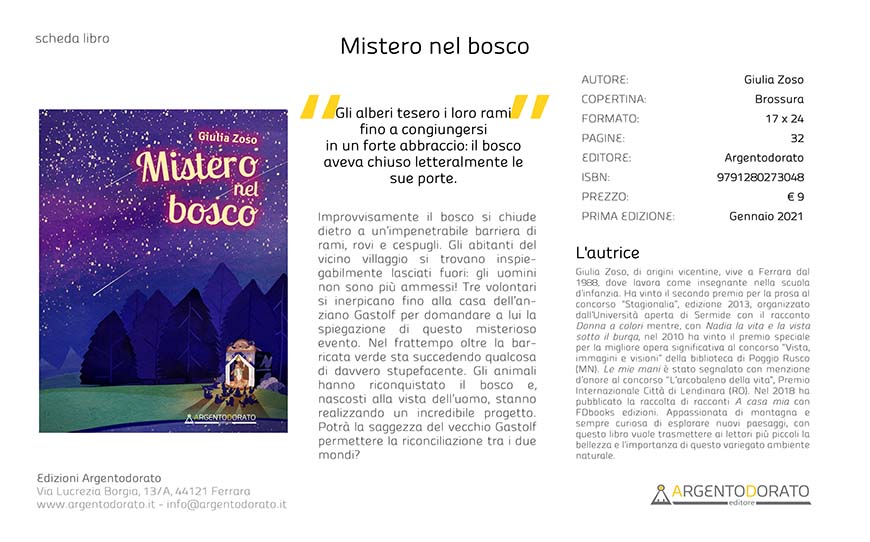 الغرض من المشروع: توزيع 100 نسخة من الكتاب المصور للأطفال "لغز في الغابة" للكاتبة جوليا زوسو المقيمة في فيرارا ، بلغتين ، الإيطالية - العربية. تنفيذ مبادرات مشتركة بمشاركة أطفال سوريين وإيطاليين لتحقيق الأهداف المذكورة أعلاه.